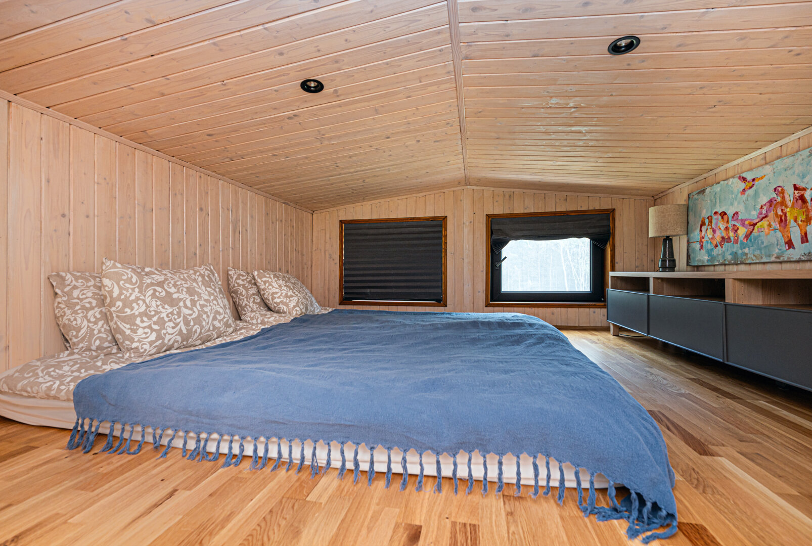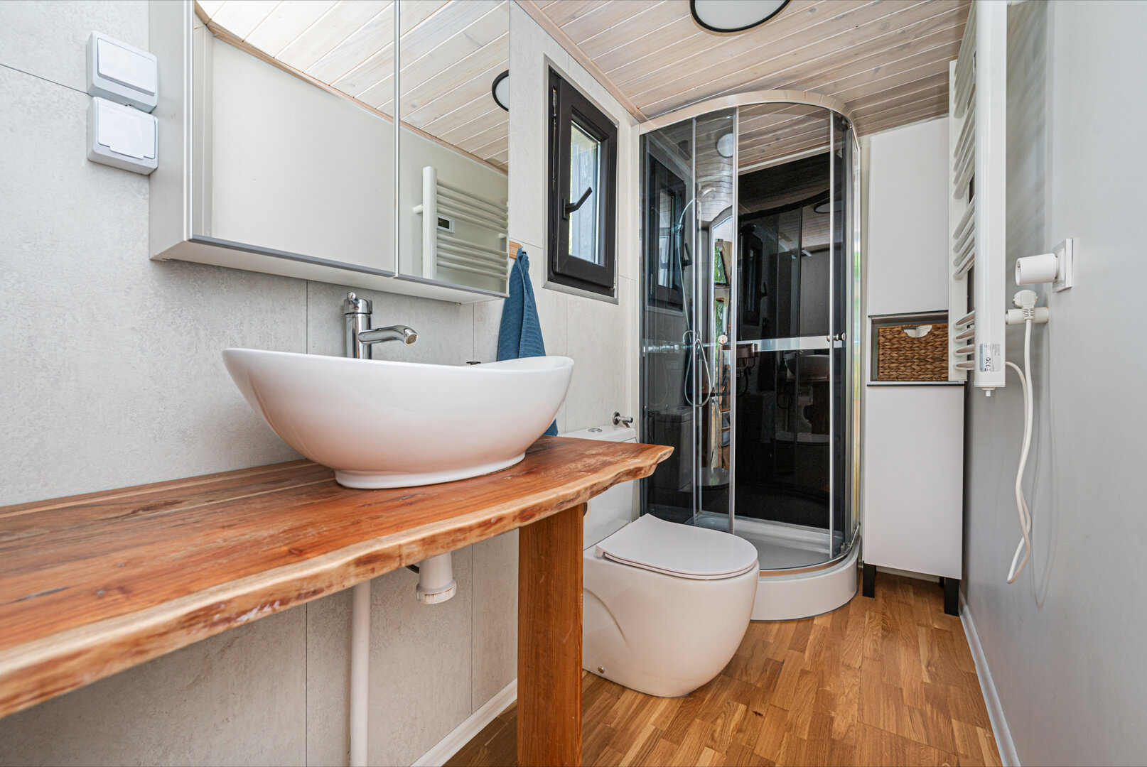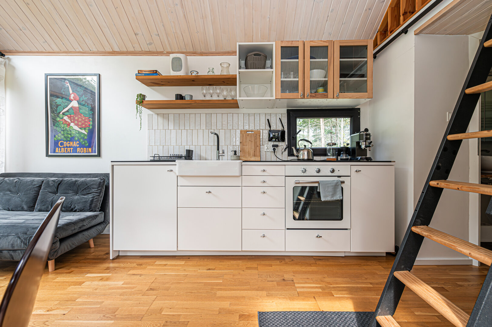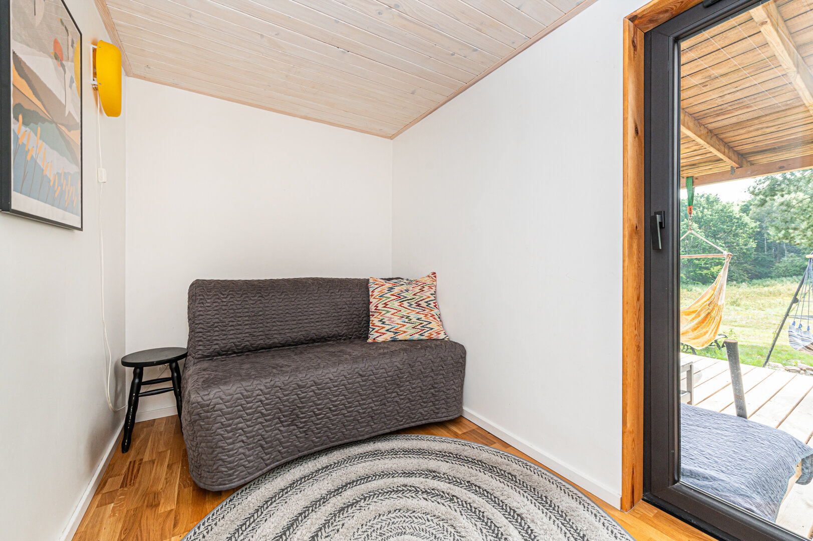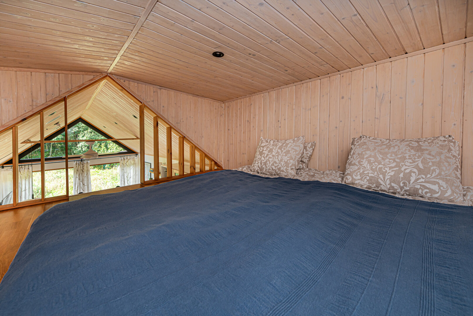 Domek: W domku znajduje się antresola z dużym łóżkiem, a na dole rozkładana kanapa w sypialni i druga w salonie. Na parterze znajduje się salon z kuchnią oraz wygodny taras. Jest też łazienka z prysznicem i pralką. Z rzeczy (czasem) przydatnych w domku jest [m.in. suszarka do włosów oraz żelazko. Kuchnia jest w pełni wyposażona, poczynając od piekarnika i lodówki, kończąc na czajniku, młynku do kawy i ekspresie, blasze do ciast i naczyniach. Do wygodnego gotowania dla paczki przyjaciół lub rodziny nie zabraknie Wam niczego.